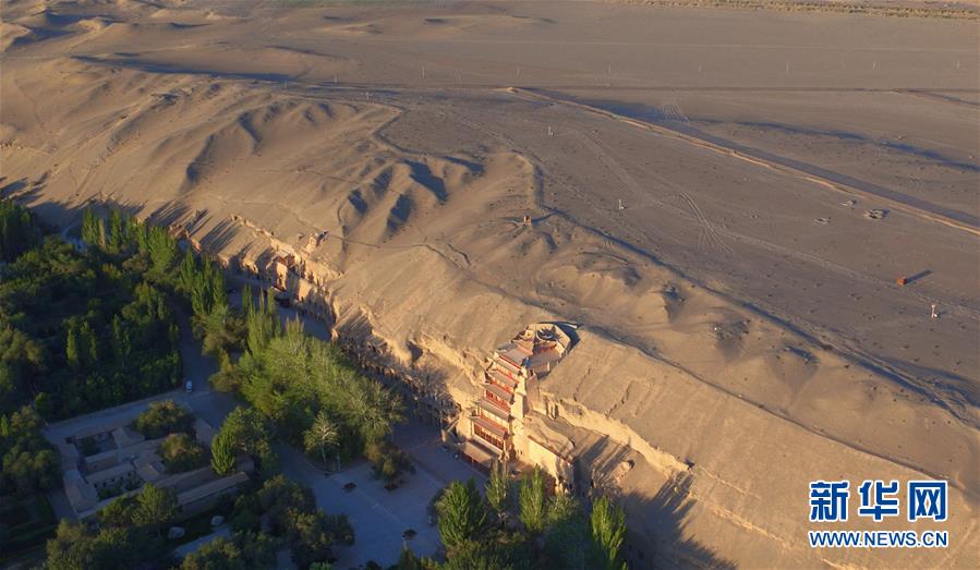 這是世界文化遺產莫高窟(2016年9月7日無人機拍攝)。 敦煌記錄歷史。開放的胸襟,曾讓這里成為古代絲綢之路上“華戎所交一都會”。 時隔千年,改革開放的春風吹入西北內陸小城,敦煌再度成為中國對外開放的文化前沿。 新華社記者 陳斌 攝