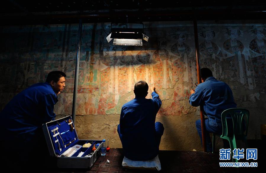 技術(shù)人員在莫高窟內(nèi)對(duì)病害壁畫進(jìn)行修復(fù)(2014年9月3日攝)。 敦煌記錄歷史。開放的胸襟,曾讓這里成為古代絲綢之路上“華戎所交一都會(huì)”。 時(shí)隔千年,改革開放的春風(fēng)吹入西北內(nèi)陸小城,敦煌再度成為中國對(duì)外開放的文化前沿。 新華社記者 陳斌 攝