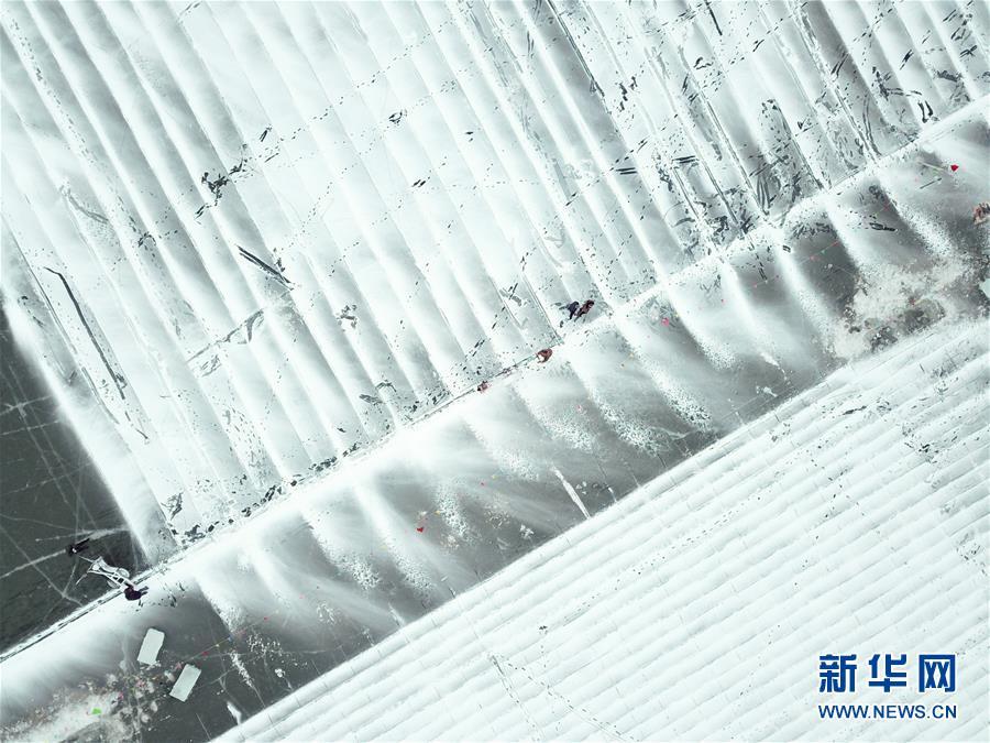 在松花江哈爾濱段江面,工人們?cè)谶M(jìn)行切割和采冰工作(12月12日無(wú)人機(jī)拍攝)。 黑龍江哈爾濱市的冰雪主題樂(lè)園哈爾濱冰雪大世界的采冰和建設(shè)工作近日拉開(kāi)帷幕。為保證足夠的優(yōu)質(zhì)冰供給,每天有近千名采冰人和700多輛運(yùn)冰車(chē)參與到采冰工作。 新華社記者 王松 攝