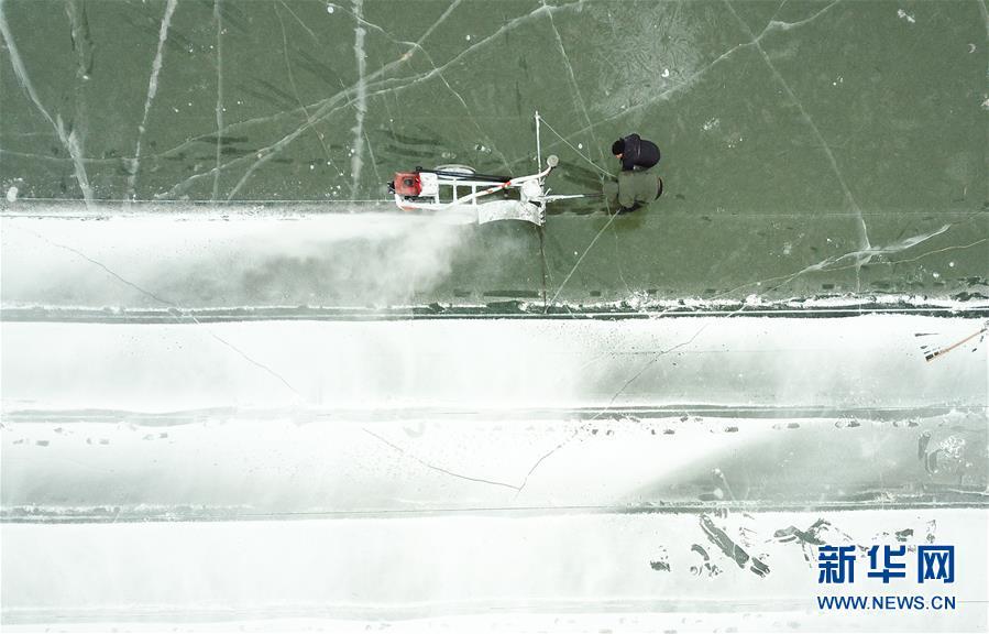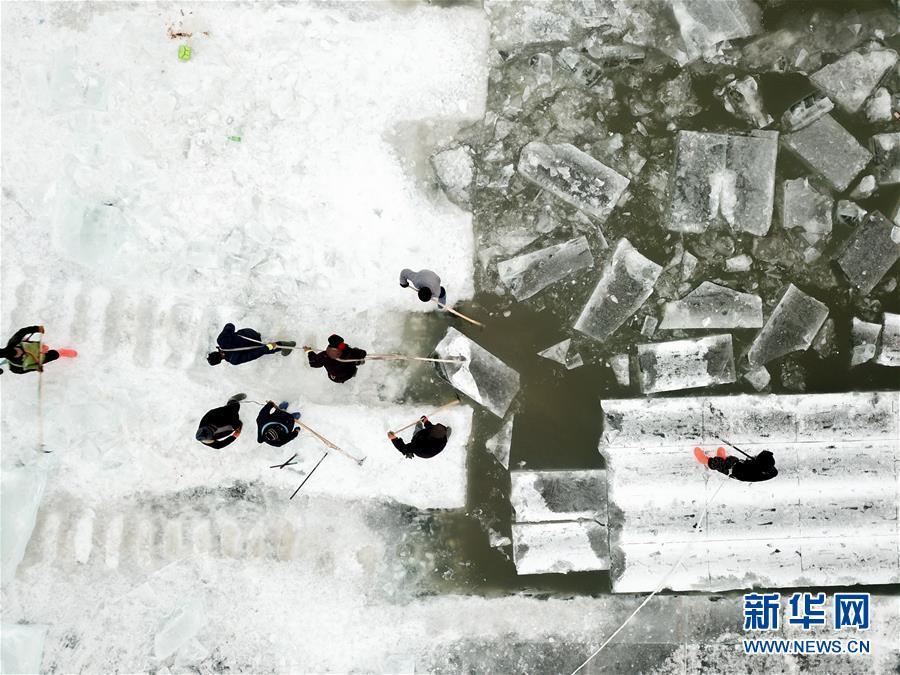 在松花江哈爾濱段江面,工人們在進(jìn)行切割和采冰工作(12月12日無人機(jī)拍攝)。 黑龍江哈爾濱市的冰雪主題樂園哈爾濱冰雪大世界的采冰和建設(shè)工作近日拉開帷幕。為保證足夠的優(yōu)質(zhì)冰供給,每天有近千名采冰人和700多輛運冰車參與到采冰工作。 新華社記者 王松 攝