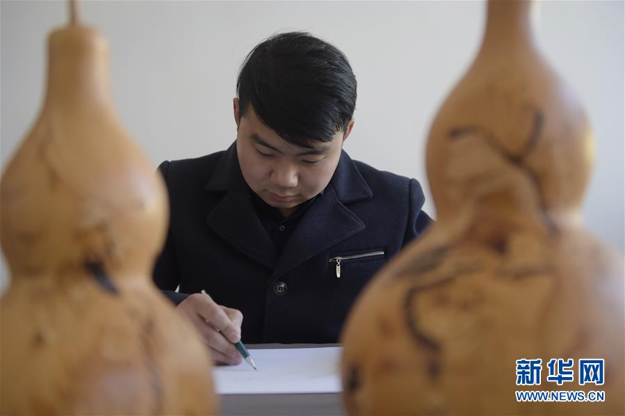 12月18日,劉征在自己的加工坊里設(shè)計(jì)葫蘆衍生品的草圖。 新華社記者 魯鵬 攝