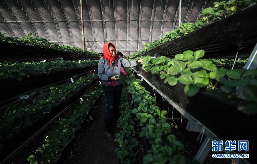 12月19日,農(nóng)戶在大棚里管理草莓。 2017年5月,遼寧省鐵嶺市昌圖縣大四家子鎮(zhèn)方家船口村利用土地確權(quán)成果,由村兩委班子成員領(lǐng)辦創(chuàng)辦了昌圖久晟果木蔬菜種植專業(yè)合作社。到2018年9月,合作社利用產(chǎn)業(yè)扶貧資金、壯大村集體經(jīng)濟(jì)扶持資金、村集體用地和村民入股資金建成了11個(gè)“股份制大棚”,主要種植草莓等作物,產(chǎn)品通過電商銷往云南、四川、北京、上海等地,預(yù)計(jì)第一期可為265名貧困戶每人分紅860元。 新華社記者潘昱龍攝