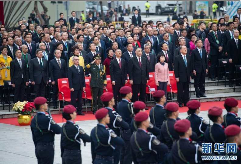 12月20日,澳門特區(qū)行政長官崔世安(前右三)、中央人民政府駐澳門聯(lián)絡(luò)辦公室副主任姚堅(jiān)(前左三)、外交部駐澳門特別行政區(qū)特派員公署特派員沈蓓莉(前右二)等出席升旗儀式。新華社記者 張金加 攝