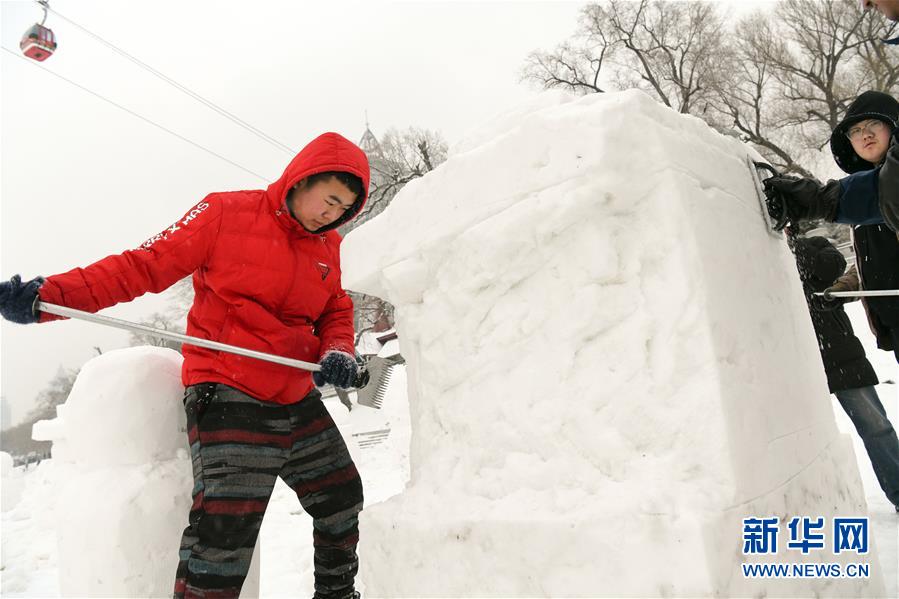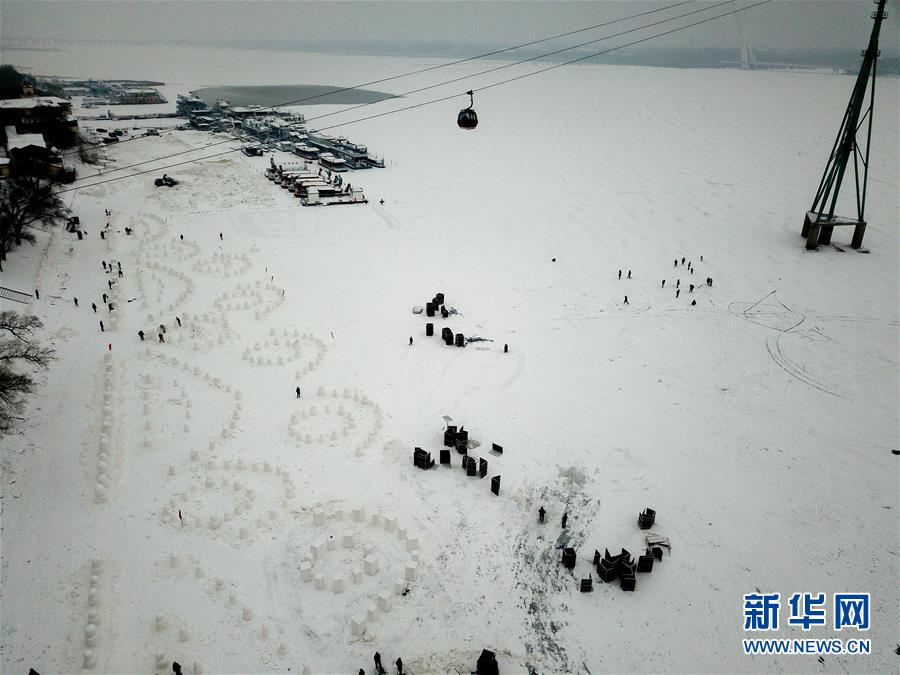 12月21日,在松花江哈爾濱段江面上,工作人員在制作雪人。新華社記者王松攝