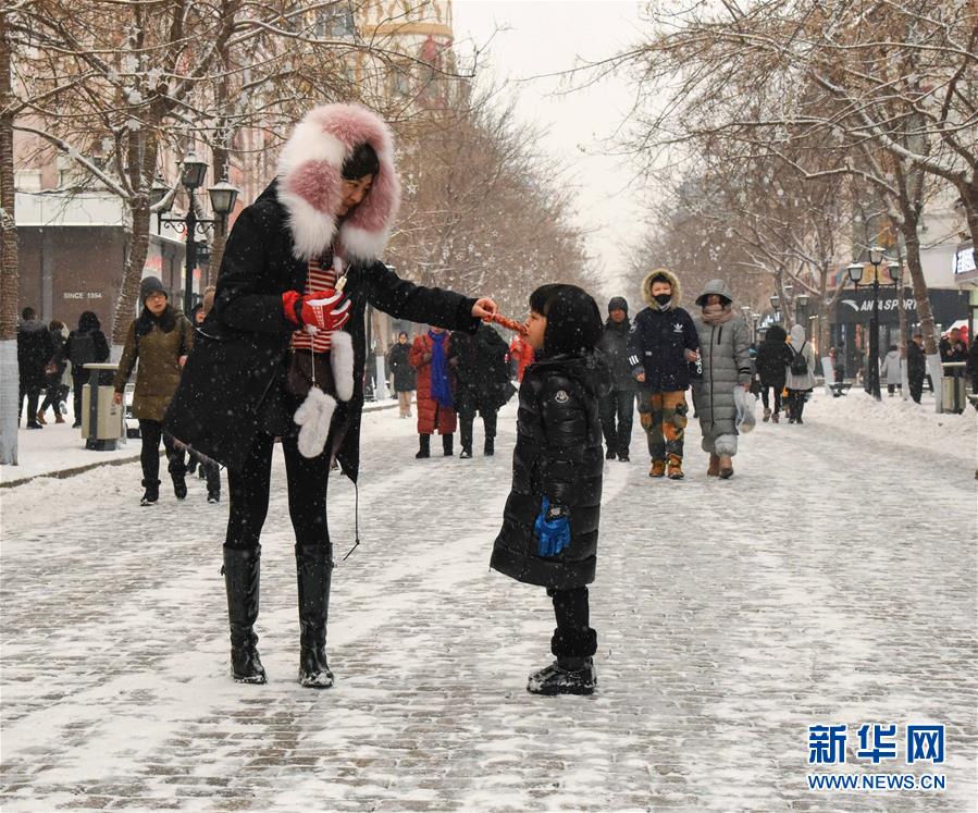 12月21日,游客在哈爾濱中央大街游覽。當(dāng)日,“冰城”哈爾濱迎來降雪天氣,整個(gè)城市變得銀裝素裹。新華社記者韓宇攝