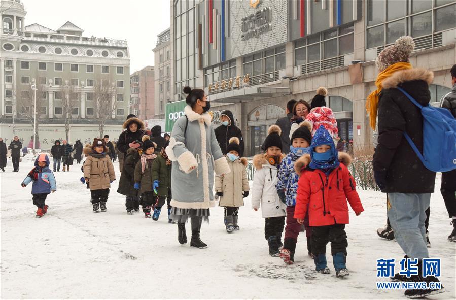 12月21日,游客在哈爾濱中央大街游覽。當日,“冰城”哈爾濱迎來降雪天氣,整個城市變得銀裝素裹。新華社記者韓宇攝