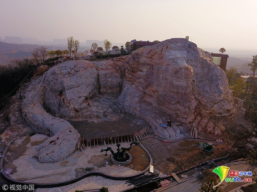2018年12月23日,南京浦口區(qū)老山風(fēng)景區(qū)三河采石場宕口,利用宕口廢棄工地進行生態(tài)修復(fù)的蜂巢酒店主體完工。經(jīng)過100名雕刻工人近半年的施工,酒店兩側(cè)被破壞的山體變成兩只高30多米的巨型山體雕塑石獅,栩栩如生,場面極其震撼。