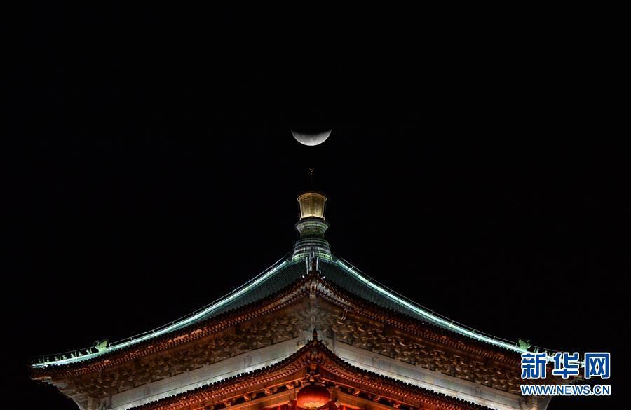 這是1月31日在陜西省西安市鐘樓拍攝的月亮。 在即將過(guò)去的2018年,各地?cái)z影師用鏡頭記錄下四季中國(guó)。大江南北,一幅幅色彩斑斕的美麗畫卷徐徐展開(kāi)。 新華社記者 李一博 攝