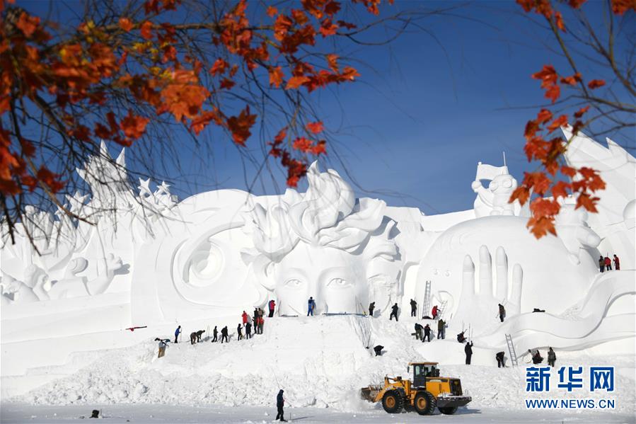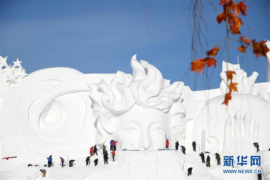 12月24日,雪雕師在制作太陽島雪博會主塑“星河之旅”。 當(dāng)日,哈爾濱太陽島雪博會主塑露出“芳容”。本屆雪博會主塑“星河之旅”長106米,高32米,寬20米,用雪量達4萬立方米。 新華社記者 王建威 攝