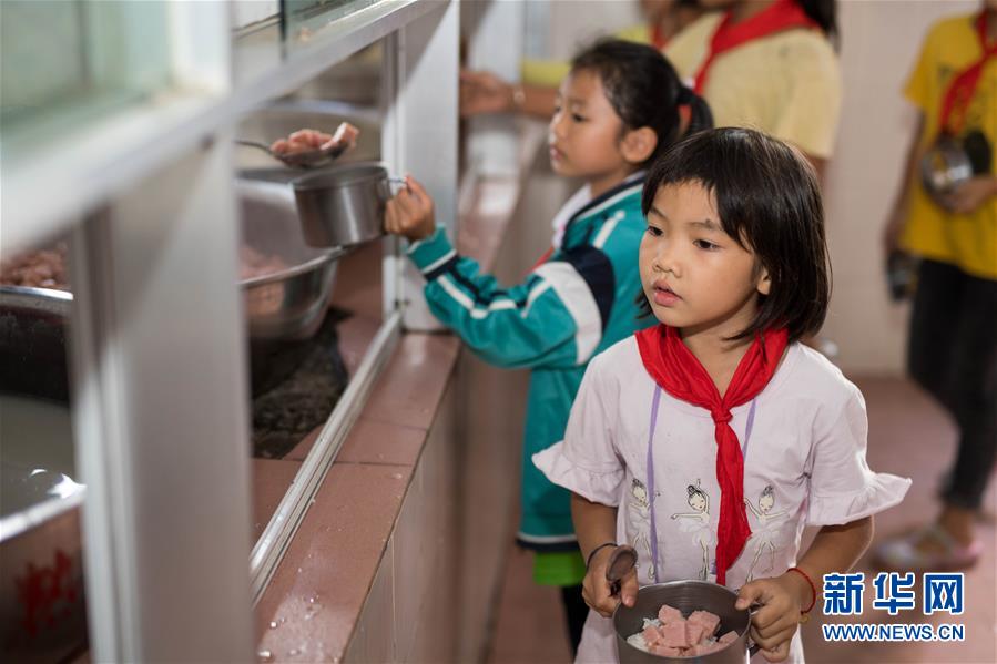 在云南省金平苗族瑤族傣族自治縣者米鄉(xiāng)中心小學,孩子們在食堂打飯,準備吃營養(yǎng)晚餐(11月13日攝)。新華社記者 胡超 攝