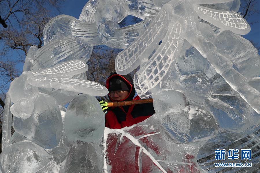 12月27日,選手在比賽中完善冰雕作品。 當(dāng)日,第十六屆黑龍江省大學(xué)生冰雕藝術(shù)設(shè)計(jì)創(chuàng)作大賽在哈爾濱兆麟公園落下帷幕,全省高校共有99支隊(duì)伍參賽。 新華社記者曹霽陽攝