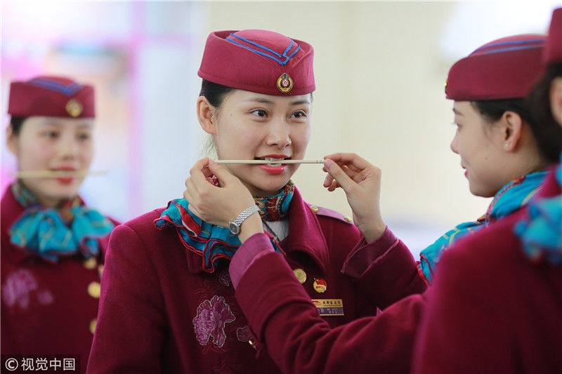 2018年12月27日,四川成都,為備戰(zhàn)即將開通的成雅鐵路,中國鐵路成都局集團有限公司成都客運段動車二隊對成雅動車的乘務人員進行理論、形體、服務禮儀等內(nèi)容的培訓。