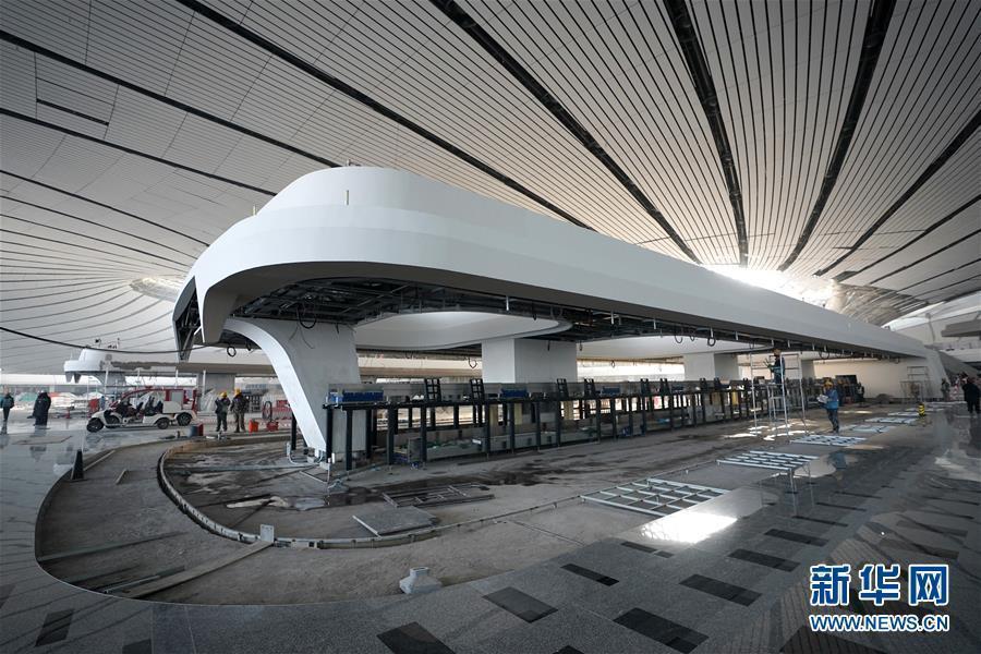 在北京大興國際機場主航站樓內,施工人員在進行裝飾裝修工作。新華社記者 鞠煥宗 攝 圖片來源:新華網