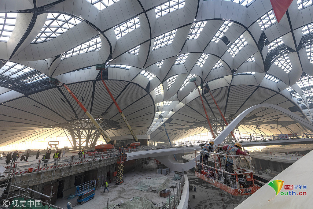 2018年12月19日,北京大興國際機場航站樓的室內裝修在有條不紊的推進中。視覺中國