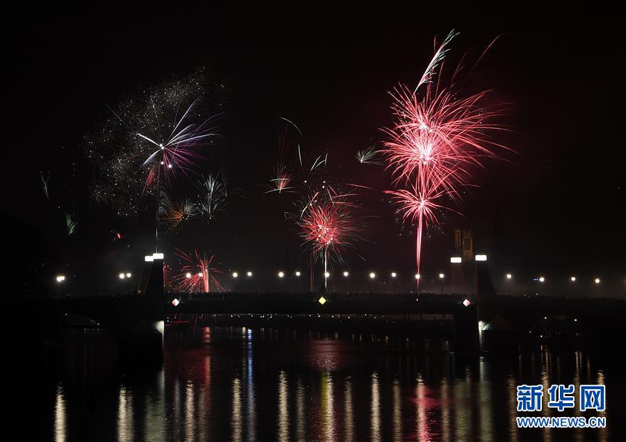 2018年12月31日,德國(guó)法蘭克福美因河畔煙花綻放。 新華社記者逯陽(yáng)攝