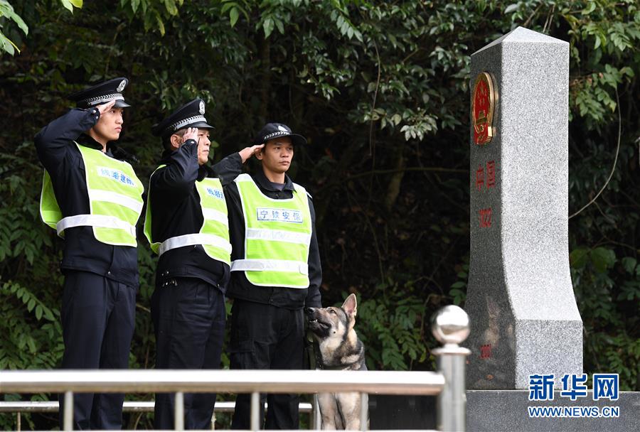 鐵路公安民警陸日峰(左二)和同事在中越邊境巡線(xiàn)時(shí)向界碑敬禮(2018年12月31日攝)。 新華社記者陸波岸攝