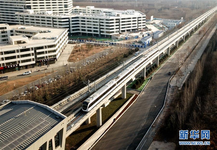 這是2018年12月29日無人機(jī)拍攝的車輛通過濟(jì)南軌道交通1號(hào)線創(chuàng)新谷站。新華社記者朱崢攝