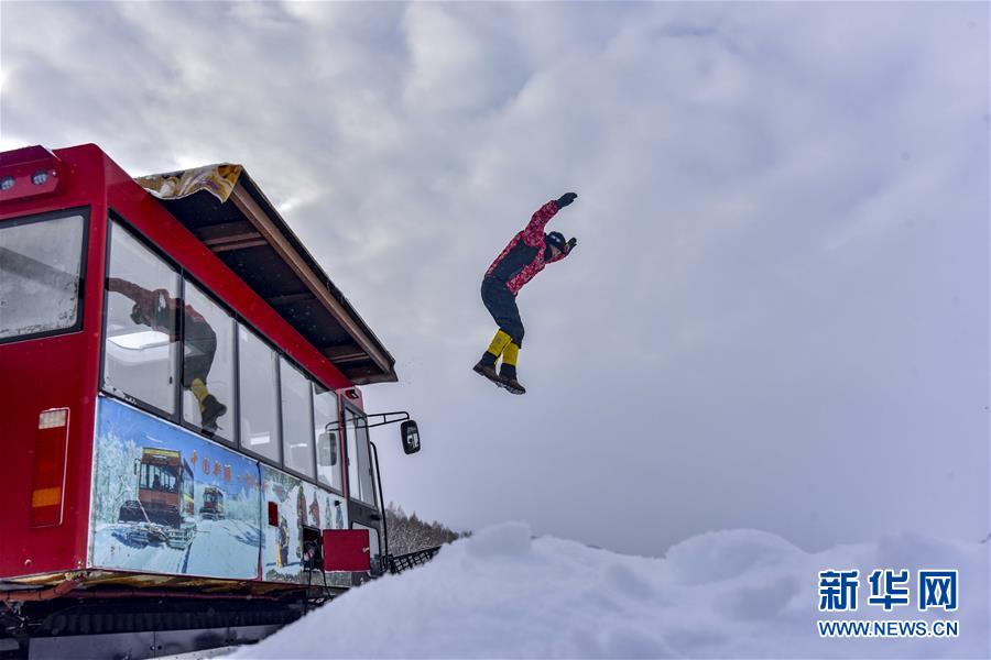 1月1日,在新疆禾木雪鄉(xiāng),一名游客體驗(yàn)“跳雪”。
