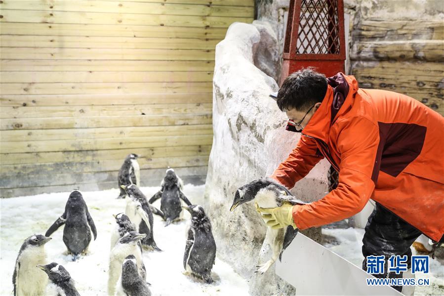 1月9日,馴養(yǎng)員給白眉企鵝寶寶喂食。 新華社記者 潘昱龍 攝