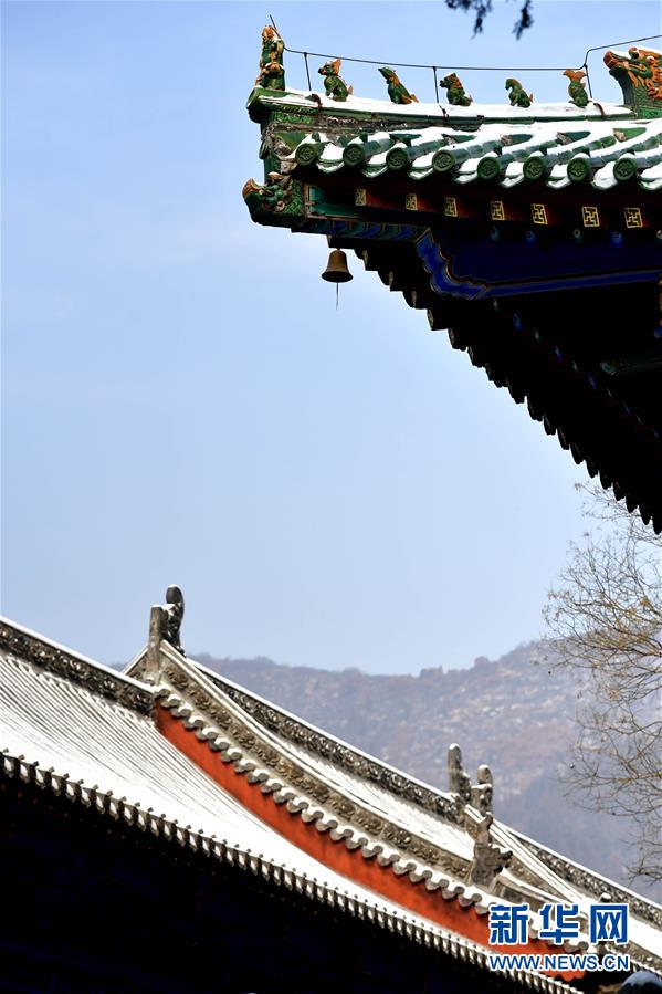1月10日無(wú)人機(jī)拍攝的少林寺一景。當(dāng)日,雪后初霽,河南登封少林寺分外秀美。 新華社記者 馮大鵬 攝