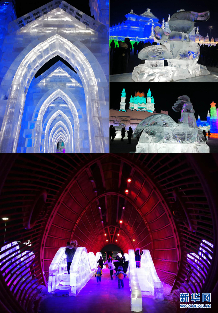 1月5日,游客們?cè)诠枮I冰雪大世界的各式冰建筑中游玩。 新華網(wǎng)記者 張明宇 攝