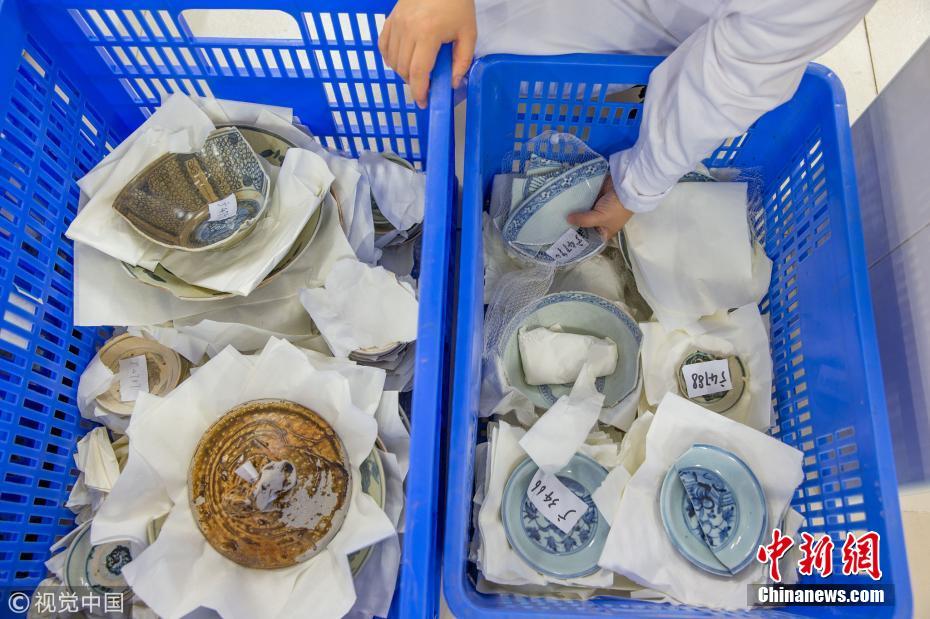 廣東省博物館文物保護(hù)科技中心出水文物保護(hù)實(shí)驗(yàn)室里,修復(fù)后的出水瓷器。譚慶駒 攝 圖片來源:視覺中國