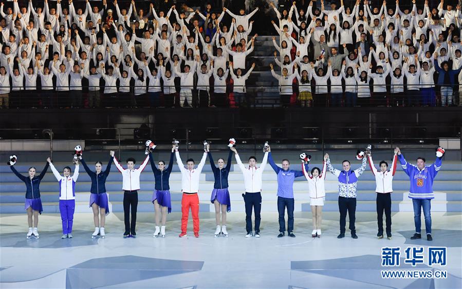 1月15日,中芬運(yùn)動(dòng)員代表攜手向觀(guān)眾致意。 當(dāng)日,“2019中芬冬季運(yùn)動(dòng)年”開(kāi)幕式在北京首鋼冰球館舉行。 新華社記者申宏攝