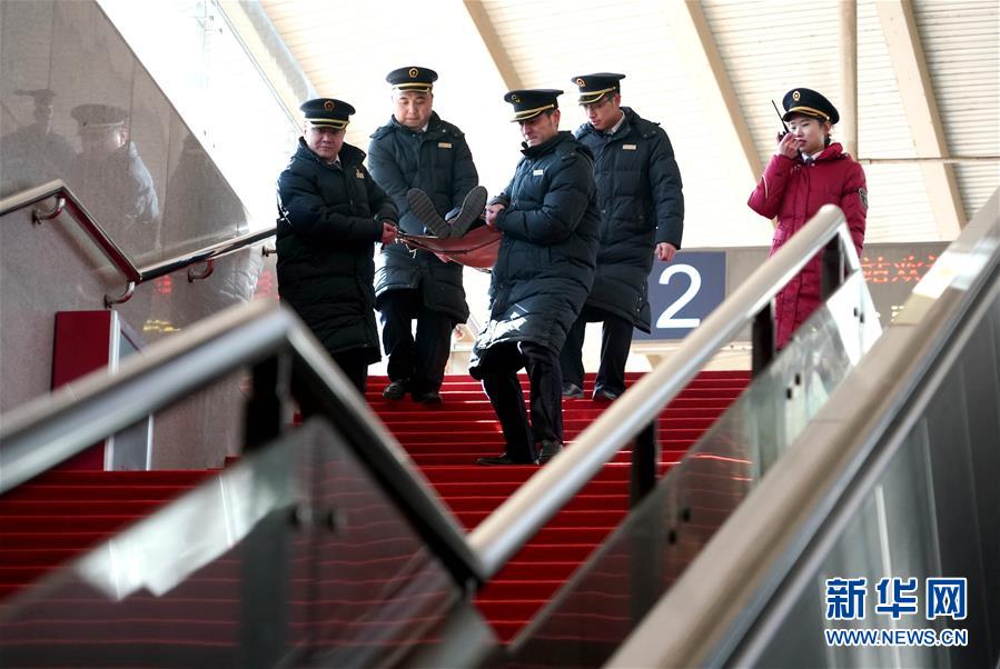 1月16日,鶴壁東站的職工在進(jìn)行列車下交重傷病旅客應(yīng)急演練。 當(dāng)日,中國(guó)鐵路鄭州局集團(tuán)有限公司新鄉(xiāng)車務(wù)段鶴壁東站組織職工開(kāi)展服務(wù)禮儀、手語(yǔ)等業(yè)務(wù)培訓(xùn),并進(jìn)行非正常情況應(yīng)急演練,為2019年春運(yùn)做準(zhǔn)備。 新華社記者李安攝