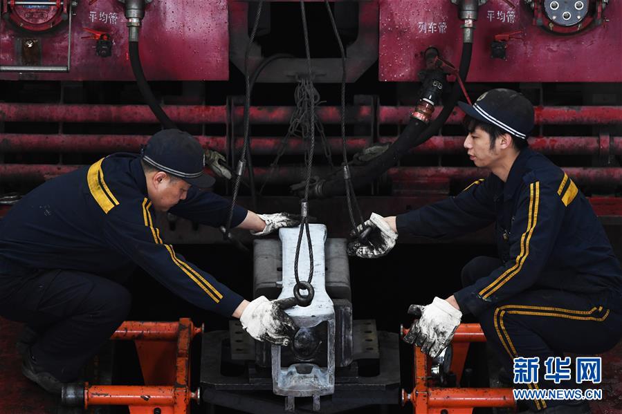 1月16日,重慶機(jī)務(wù)段職工在對機(jī)車車鉤進(jìn)行檢修。 臨近春運(yùn),為確保春運(yùn)旅客和貨物列車運(yùn)輸安全,中國鐵路成都局集團(tuán)有限公司重慶機(jī)務(wù)段對全段機(jī)車進(jìn)行專項(xiàng)檢查、整修,為即將到來的春運(yùn)做準(zhǔn)備。 新華社記者王全超攝