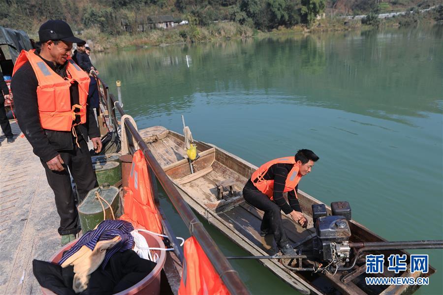 1月22日,賴福昌(右)在發(fā)動(dòng)小船上的發(fā)動(dòng)機(jī),小船是大船的動(dòng)力來源。 新華社記者 歐東衢 攝
