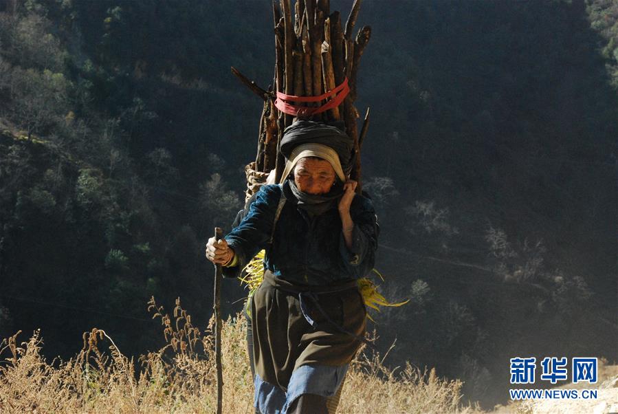 1月25日,在云南省蘭坪縣,余永妹背柴回家。