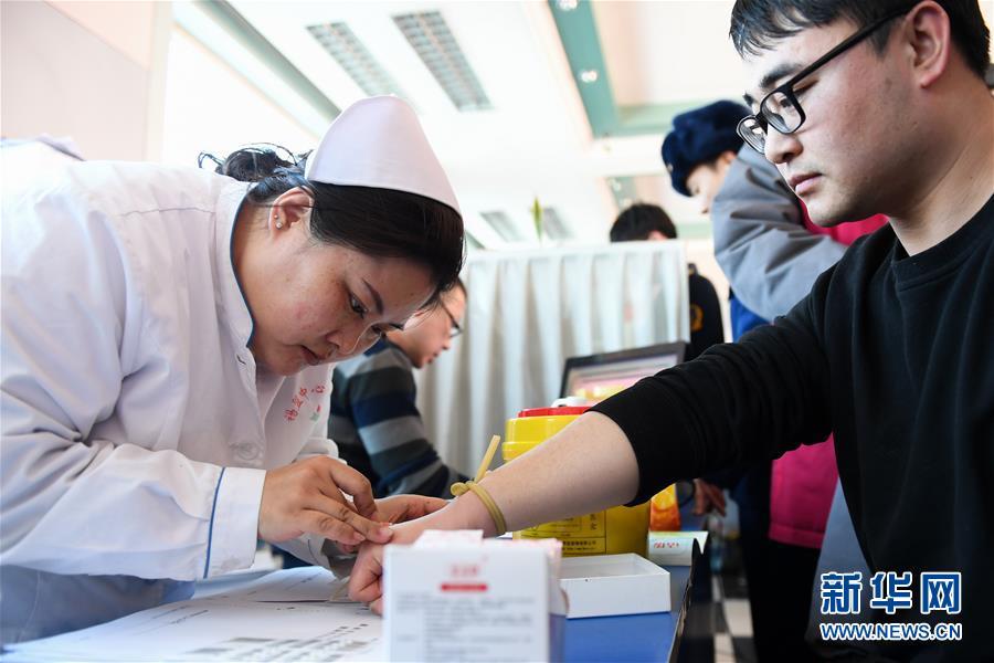 2月24日,在錫林郭勒盟中心血站,工作人員在為前來獻血的志愿者檢驗血型。 內(nèi)蒙古自治區(qū)錫林郭勒盟“2·23”重大事故傷者正在錫林郭勒盟醫(yī)院、錫林郭勒盟蒙醫(yī)醫(yī)院接受救治。因用血需求量大,當?shù)匮獛鞄齑嬉欢鹊陀诰渚€。在當?shù)卣h下,各單位職工、市民紛紛前往錫林郭勒盟中心血站獻血。截至24日16時,已有220余名志愿者完成獻血,采集全血6.8萬毫升,機采血小板9個治療量。 新華社記者 劉磊 攝