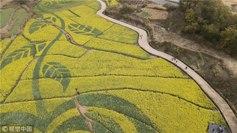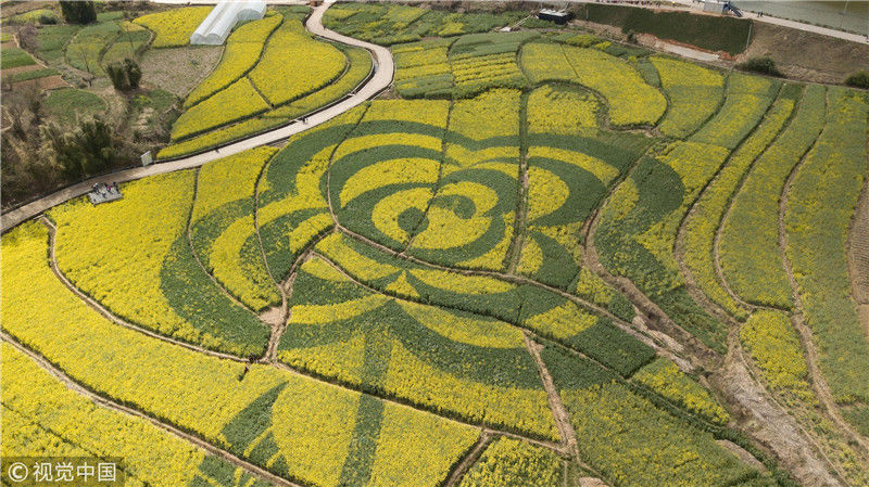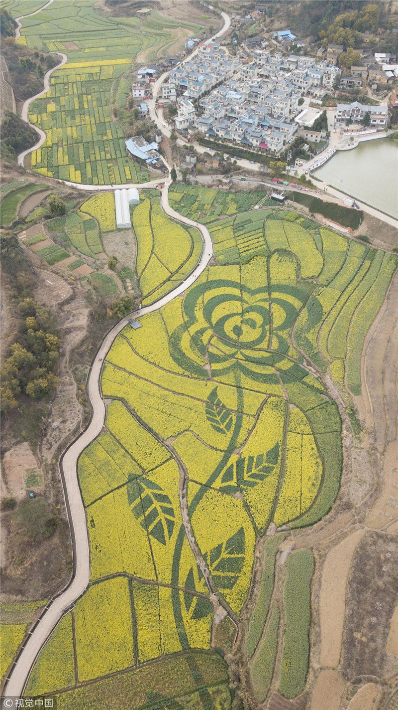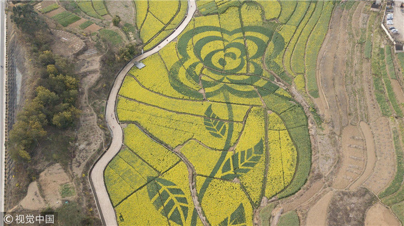 2019年近日,在云南省安寧市山口村,油菜花田里“長(zhǎng)出”一朵巨大的“山茶花”,吸引游客到此觀賞拍照。圖為3月1日,航拍油菜花田中的山茶花圖案。劉冉陽(yáng)(云南分社)/中新社/視覺(jué)中國(guó)