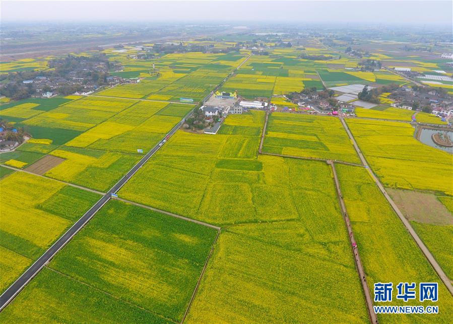 初春時(shí)節(jié),四川廣漢市西高鎮(zhèn)的油菜花盛開。金黃的油菜花與民居、道路等形成一幅幅鄉(xiāng)村畫卷,吸引游人踏青賞景。