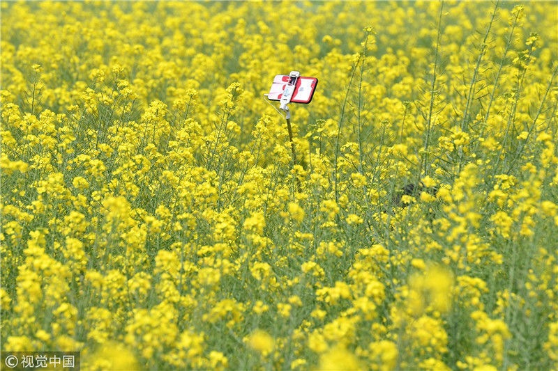 2019年3月1日,一名游客“隱身”在花海中,只露出夾著手機(jī)的自拍桿。近日,位于云南省安寧市的大片油菜花進(jìn)入盛花期,吸引民眾到此賞花。