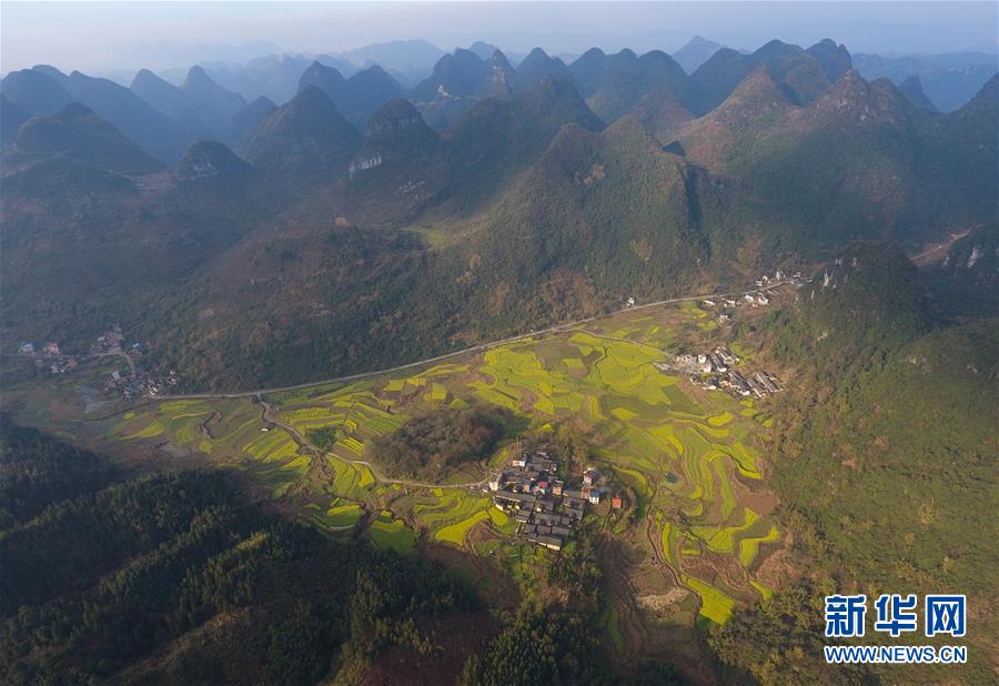 廣西融安縣東起鄉(xiāng)長(zhǎng)豐村的田園春色(3月10日無(wú)人機(jī)拍攝)。 近日,隨著氣溫持續(xù)回升,廣西融安縣境內(nèi)的油菜花開放,春意盎然。 新華社記者 黃孝邦 攝