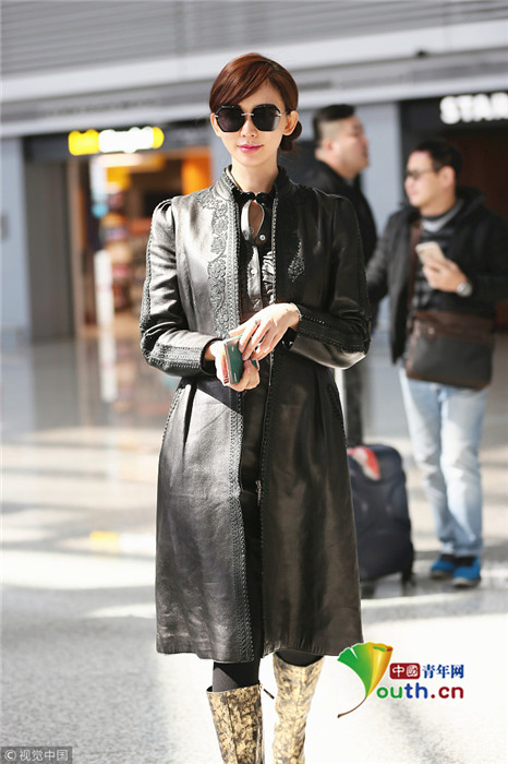 林志玲近日現身虹橋機場,黑超遮面的她身著黑色皮風衣,挎著大牌包十足御姐范,一路大方任拍,相當親和!