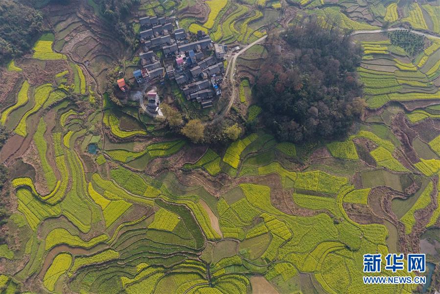 3月20日在貴州錦屏縣敦寨鎮(zhèn)拍攝的春景(無人機(jī)拍攝)。春分將至,貴州各地成片的油菜花漸次綻放,如同金色的地毯鋪上云貴高原。 新華社記者 歐東衢 攝