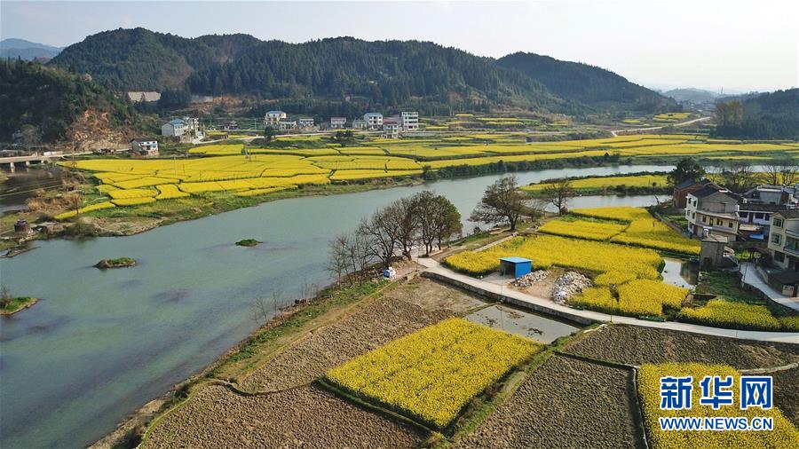 3月20日在貴州錦屏縣敦寨鎮(zhèn)拍攝的春景(無人機拍攝)。春分將至,貴州各地成片的油菜花漸次綻放,如同金色的地毯鋪上云貴高原。 新華社記者 歐東衢 攝