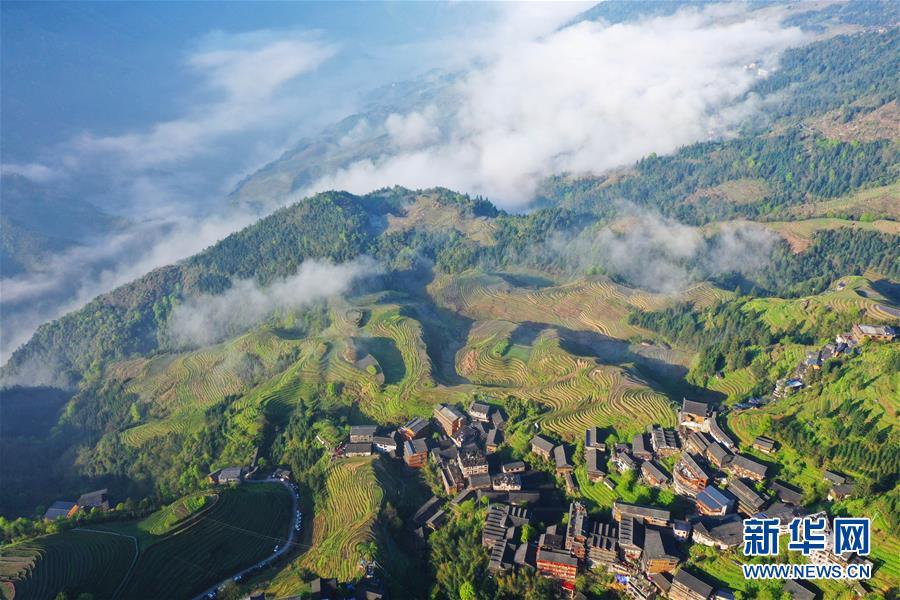 龍勝各族自治縣和平鄉(xiāng)平安村一景(4月7日無人機拍攝)。連日降雨過后,廣西龍勝各族自治縣和平鄉(xiāng)平安村的壯族村寨迎來久違的朝陽。 新華社記者 曹祎銘 攝