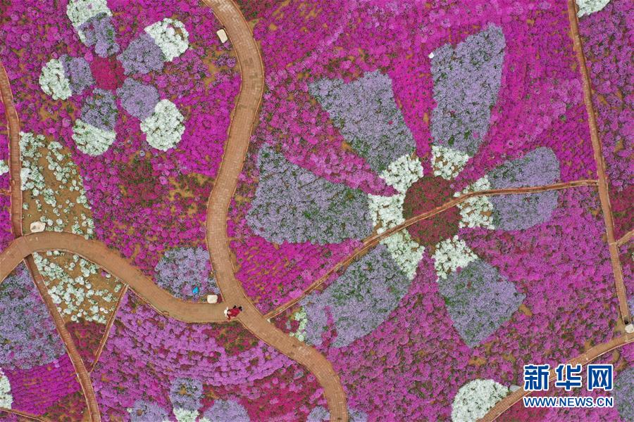 4月25日,游客在龜峰山杜鵑花海中游玩(無(wú)人機(jī)拍攝)。 近日,湖北省麻城市龜峰山的10萬(wàn)畝古杜鵑盛開(kāi),大量游客前來(lái)賞花觀景。 新華社記者 程敏 攝