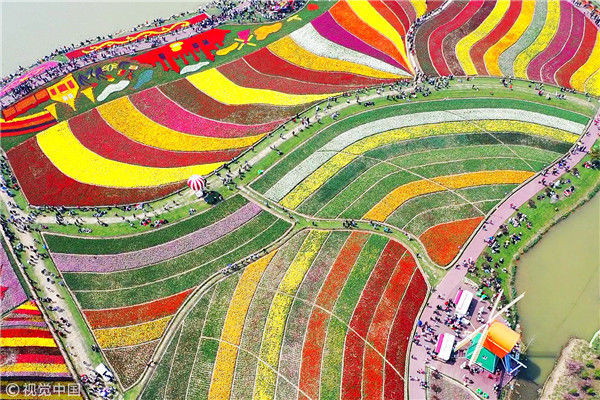 2019年4月6日,江蘇鹽城,大豐荷蘭花海景區(qū),人們?cè)谫p花游玩,盡享春光。