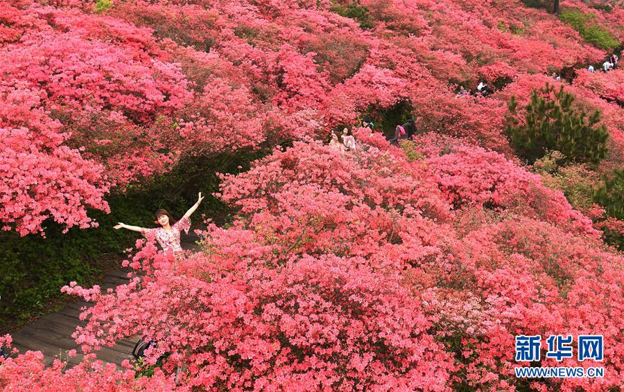 4月25日,游客在龜峰山杜鵑花海中游玩。 近日,湖北省麻城市龜峰山的10萬(wàn)畝古杜鵑盛開(kāi),大量游客前來(lái)賞花觀景。 新華社記者 程敏 攝
