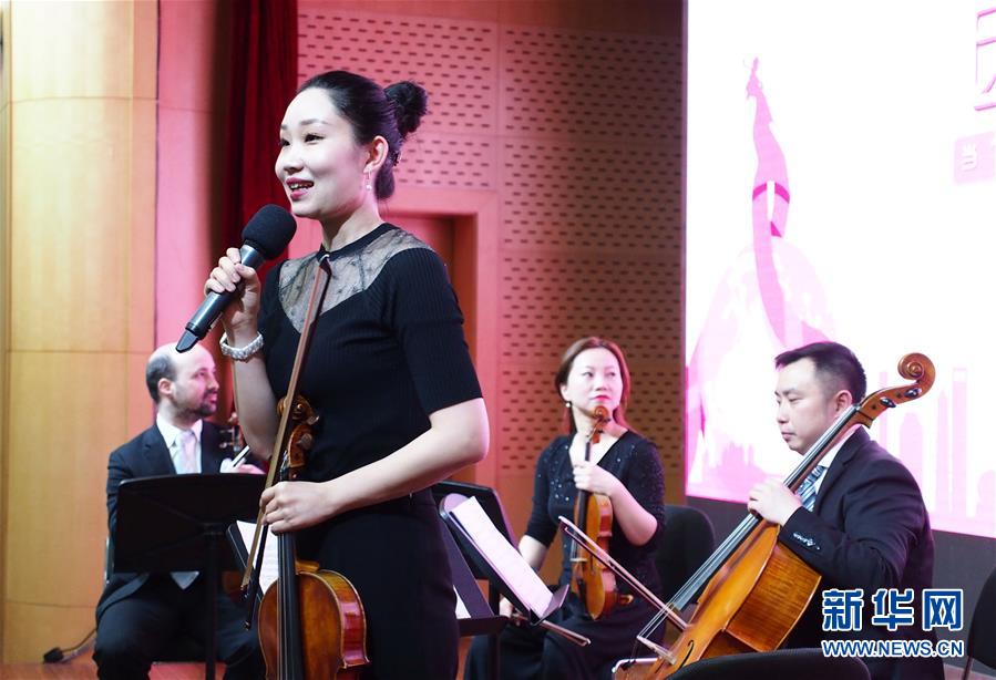 4月25日,上海交響樂(lè)團(tuán)的中提琴手巴桐在演奏前介紹曲目。 當(dāng)日,第一場(chǎng)“全城交響·上交為你而來(lái)”音樂(lè)會(huì)在復(fù)旦大學(xué)附屬腫瘤醫(yī)院報(bào)告廳奏響,為患者及醫(yī)護(hù)人員獻(xiàn)上一場(chǎng)專屬音樂(lè)會(huì)?!叭墙豁憽ど辖粸槟愣鴣?lái)”是上海交響樂(lè)團(tuán)2019年向全上海的機(jī)構(gòu)及個(gè)人開(kāi)放的公益演出項(xiàng)目。 新華社記者 任瓏 攝