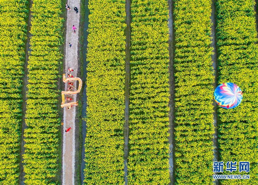 村民舞龍隊(duì)在浙江省湖州市吳興區(qū)八里店鎮(zhèn)移沿山生態(tài)景區(qū)的油菜花田里表演舞龍(3月30日無(wú)人機(jī)拍攝)。 新華社記者 徐昱 攝