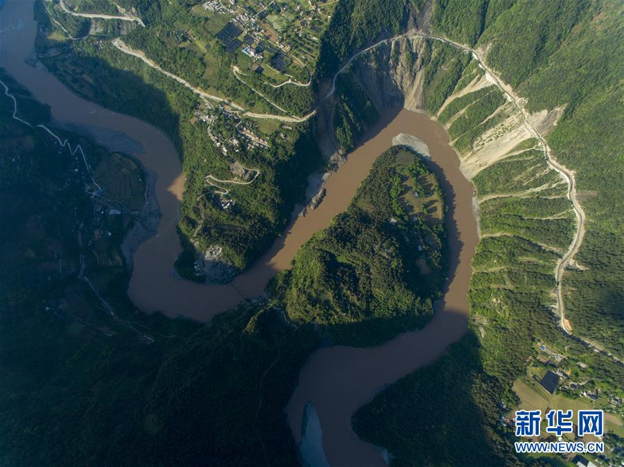 這是4月27日在云南省貢山獨龍族怒族自治縣丙中洛鎮(zhèn)拍攝的“怒江第一灣”(無人機拍攝)。 怒江自青藏高原一路奔騰向南流至云南省貢山獨龍族怒族自治縣丙中洛鎮(zhèn),高黎貢山與碧羅雪山夾江而立,江水順山勢急轉(zhuǎn)形成了一個氣勢磅礴的半圓形大灣,被稱為“怒江第一灣”。 新華社記者 江文耀 攝