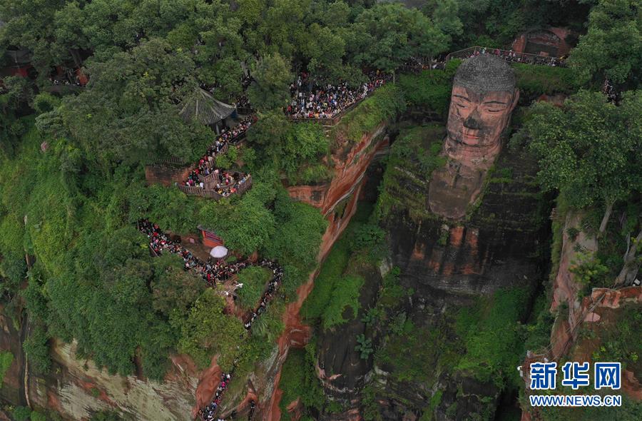 10月4日,游客在樂(lè)山大佛景區(qū)的棧道上有序排隊(duì),一睹大佛真容(無(wú)人機(jī)拍攝)。