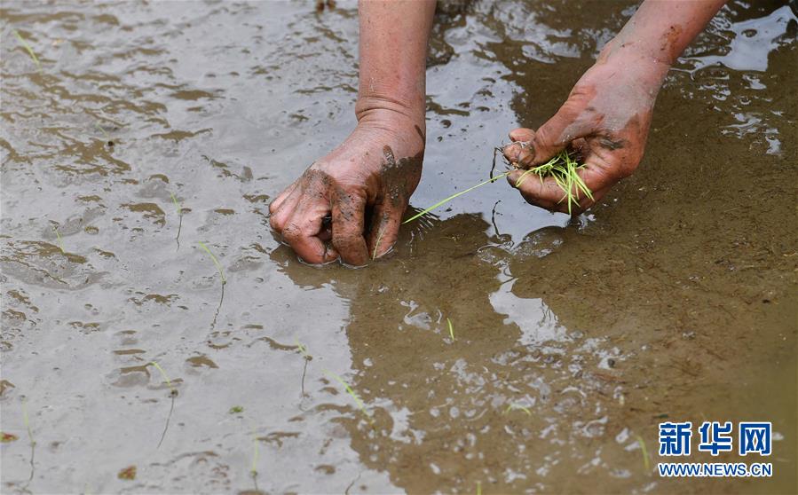 在黔桂烏英苗寨,村民在田間插秧(4月16日攝)。 新華社記者 黃孝邦 攝