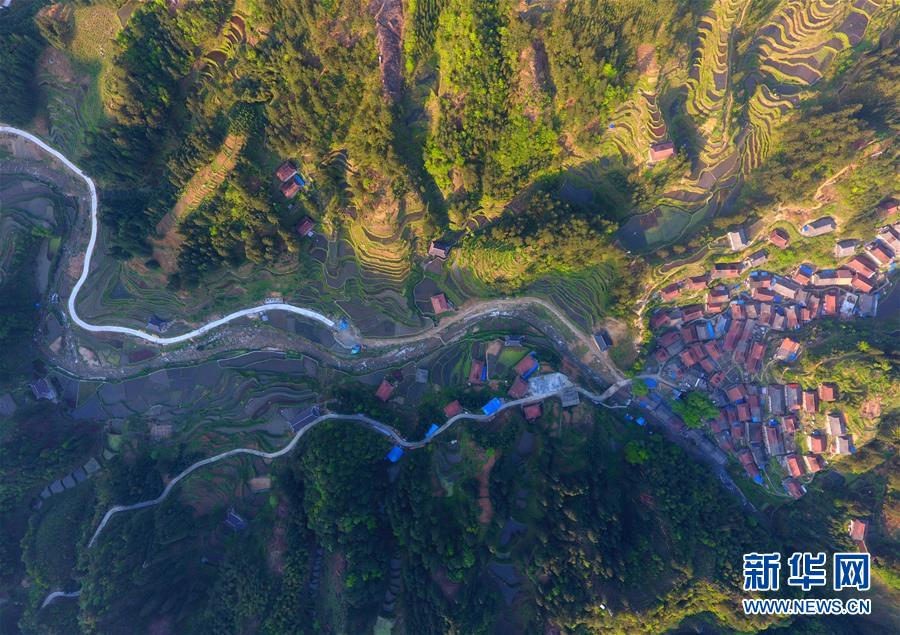 這是春耕時節(jié)的黔桂烏英苗寨梯田(4月16日無人機拍攝)。 新華社記者 黃孝邦 攝