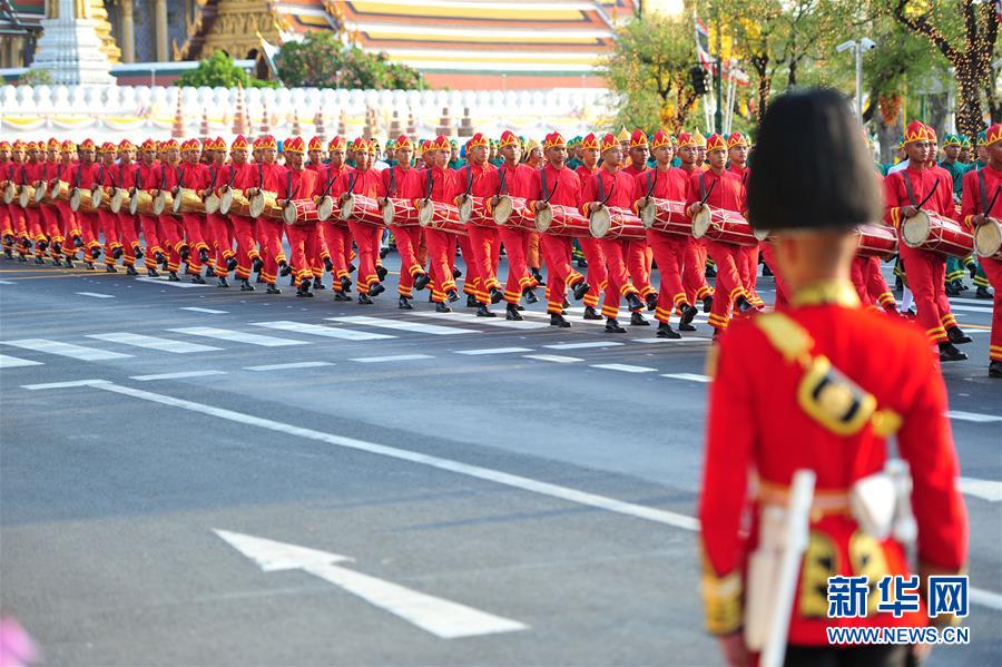 5月5日,儀仗隊(duì)在曼谷大王宮附近舉行的泰國國王加冕典禮巡游上列隊(duì)前進(jìn)。 新華社發(fā)(拉亨攝)